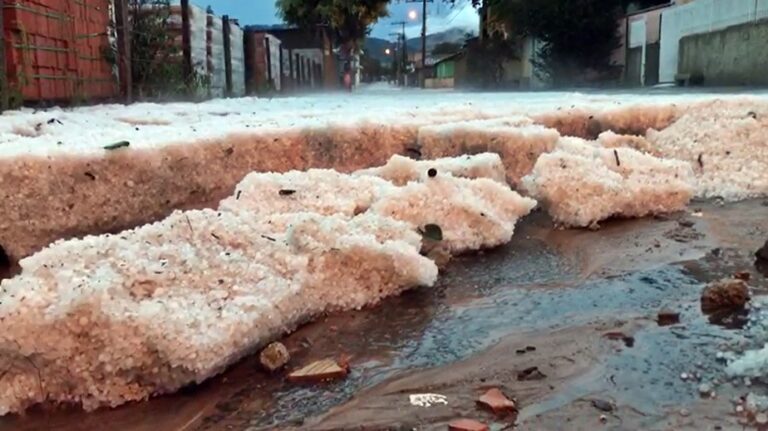 Chuva de granizo muda paisagem no campo e enche ruas de gelo em cidades do Sul de MG