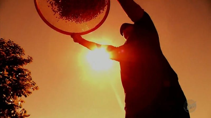 Outro aspecto a ser observado é que o operador que movimenta as leiras de café deve estar atento à orientação, ou posição, do sol, devendo sempre as leiras de café ficarem paralelas à incidência dos raios solares, ou seja, na mesma direção da sombra projetada pelo operador.
