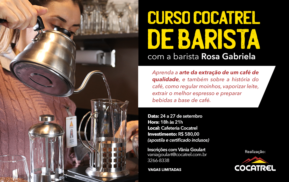 De 24 a 27 de setembro, a Cocatrel, cooperativa localizada em Três Pontas (MG), realizará um curso de barista na Cafeteria Cocatrel. O curso, com carga horária total de 12 horas, ensinará a arte da extração de um café de qualidade, e também sobre a história do café, como regular moinhos, vaporizar leite, extrair o melhor espresso e preparar bebidas a base de café.