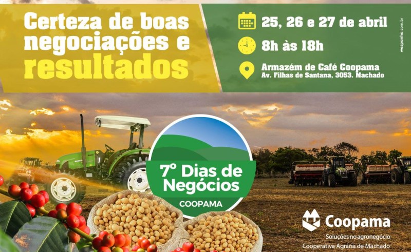 Destaque no cenário do agronegócio regional, o 7º Dias de Negócios Coopama acontecerá das 8h às 18h, nos dias 25, 26 e 27 de abril, no Armazém de Café da Coopama, localizado à Av. Filhas de Santana, 3053, Distrito Industrial – Machado, e simultaneamente nas três unidades da cooperativa sendo Unidade Elói Mendes (Av. da Paz, nº 995, Centro), Unidade Poço Fundo (Av. Prefeito José Evilásio Assi, nº 458, Nova Gimirim) e Unidade Turvolândia (Praça Dom Otávio, 141, Centro).