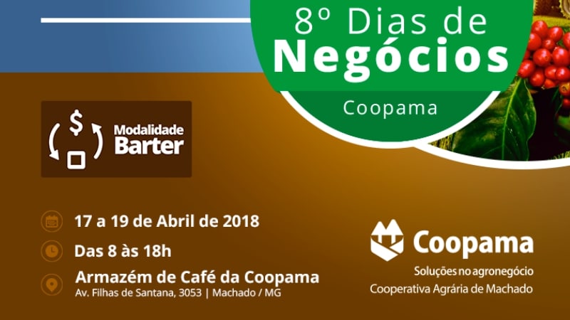 A oitava edição do Dias de Negócios será no Armazém de Café da Coopama, localizado na Avenida Filhas de Santana nº 3053, em Machado. Simultaneamente, as unidades de Poço Fundo (Av. Prefeito José Evilásio Assi, nº 458, Nova Gimirim), Elói Mendes (Av. da Paz, nº 305, Centro), Turvolândia (Praça Dom Otávio, 141, Centro) e Alfenas (Rua Iput, 667, Bairro Residencial Teixeira), também terão as mesmas condições.