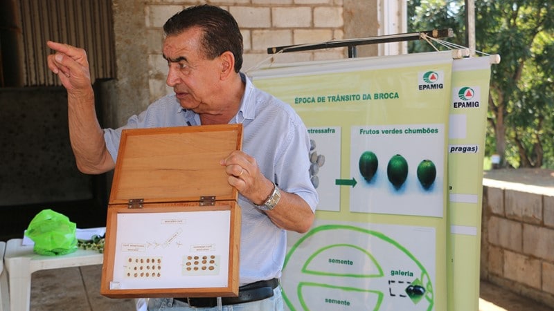 Em campo, Júlio César de Souza explicou o ciclo da broca do cafeeiro e a importância do monitoramento para evitar a infestação da praga na lavoura. O pesquisador distribuiu, aos participantes, uma planilha de monitoramento da broca e orientou quanto ao preenchimento. “Estamos no momento da floração dos cafezais, isso significa que daqui a 90 dias temos que verificar os cafezais talhão por talhão para ver se há frutos perfurados pela broca e iniciar o monitoramento e possível controle. É importante lembrar que a broca põe os ovos 45 dias após a perfuração do fruto e que antes deste período não há prejuízo aos grãos”, destacou.