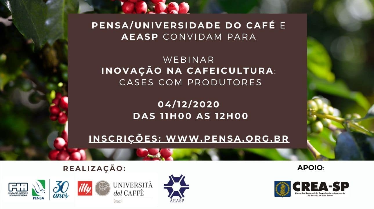 A Università del Caffè Brazil/PENSA e a Associação de Engenheiros Agrônomos do Estado de São Paulo (AEASP), com apoio do CREA-SP, convidam para o Webinar “Inovação na cafeicultura: Cases com produtores”, que acontecerá no dia 4 de dezembro de 2020, às 11h.