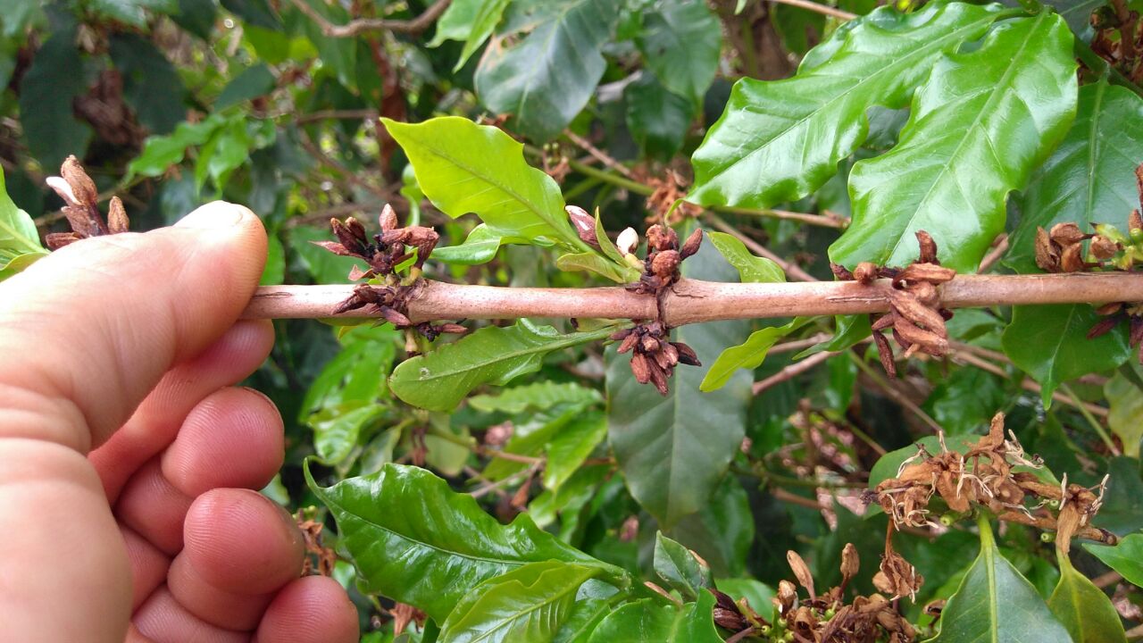 A região, segundo o produtor, ficou sem chuvas por mais de 160 dias, em meio a altas temperaturas. Além do abortamento da florada, essa condição propiciou o aparecimento de bicho mineiro, que agrava ainda mais a situação das lavouras, e estimula queda de folhas tornando-as mais fracas e comprometendo a produção do café no próximo ano.