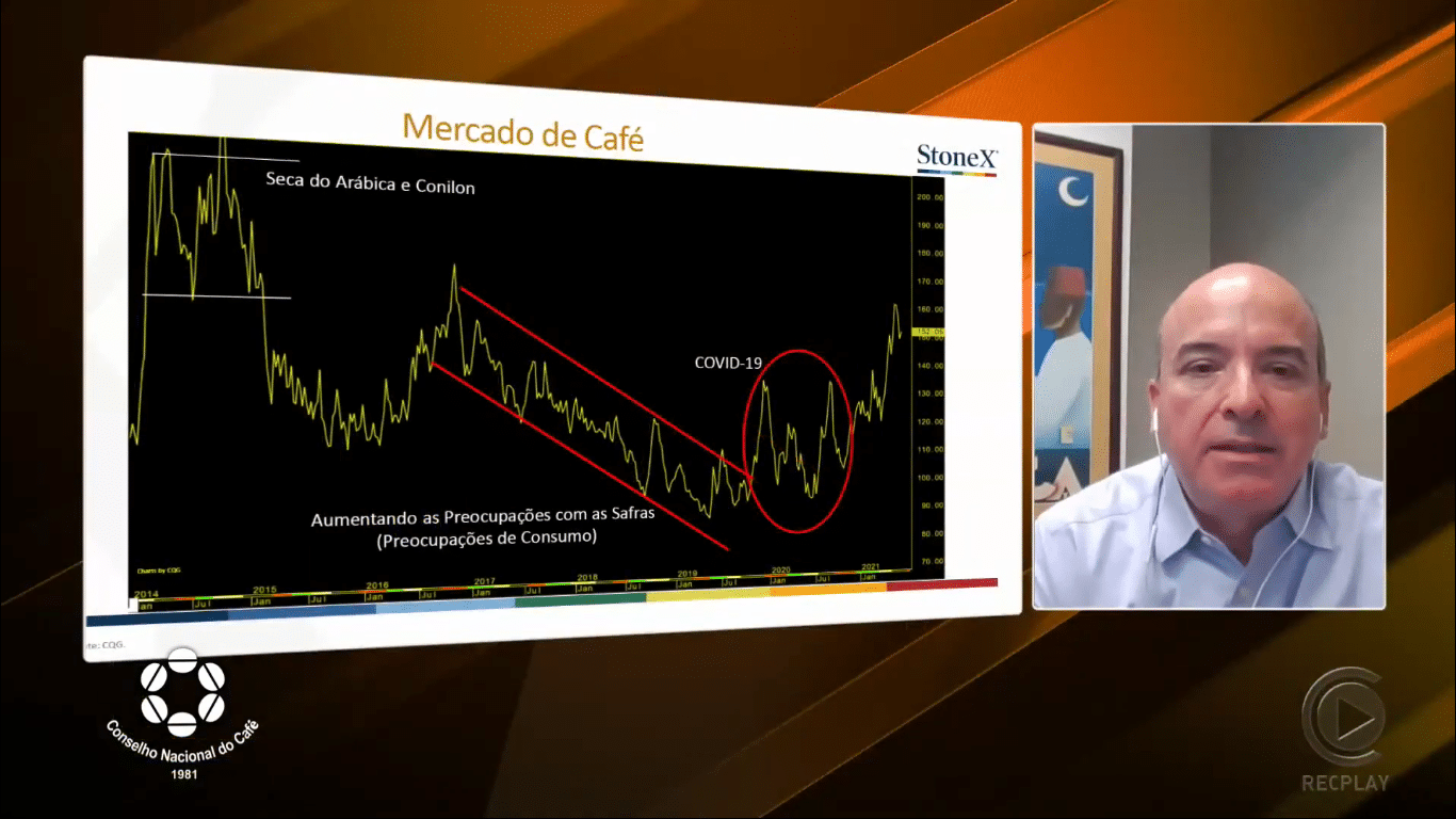 Dentro das comemorações dos 40 anos do Conselho Nacional do Café tivemos a palestra: “A principal vulnerabilidade da cafeicultura mundial e brasileira pós pandemia” com Albert Scalla – diretor vice-presidente da StoneX Financial Inc. O palestrante destacou pontos fundamentais do momento atual e do que está por vir no mercado mundial. Scalla enfatizou que não se pode controlar nem a economia, nem o câmbio mundial, apenas gerenciar. O especialista apresentou dados representativos de um mercado volátil, de 2019 em diante, por causa da pandemia.