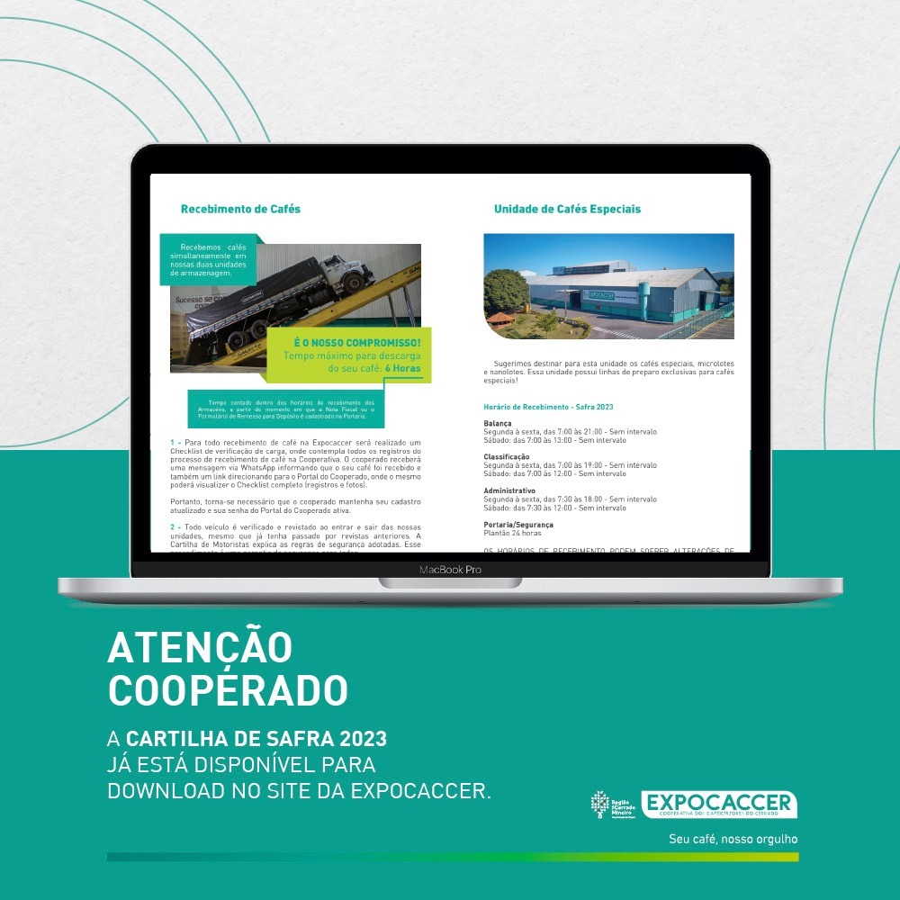 A Cartilha de Safra da Expocaccer 2023 é gratuita e funciona como um manual orientador das ações do produtor, uma vez que na cartilha constam os horários de funcionamento da sede Administrativa e das unidades de armazenamento da Expocaccer (Unidade de Cafés Especiais e Unidade BR 365), informações sobre as modalidades de recebimento de cafés, além dos serviços de armazenagem oferecidos.