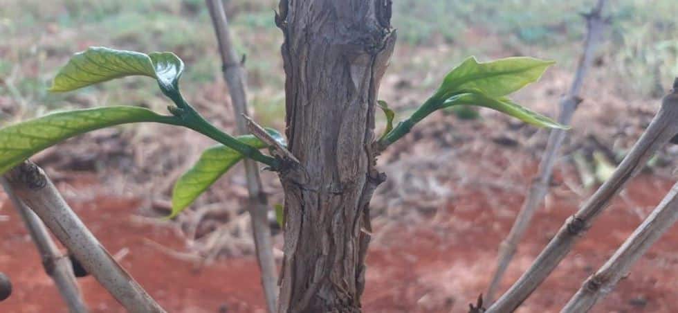Figura 1- Emissão de dois ramos plagiotrópicos ou laterais saindo do tronco de uma planta de cafeeiro junto aos locais onde haviam dois ramos laterais que morreram. Trata-se de uma ocorrência considerada inviável, pois considera-se que ali só existiria uma gema possível. Cafeeiro da cultivar arara, com dois anos de idade, lavoura irrigada, na região Norte de MG – Jul/23