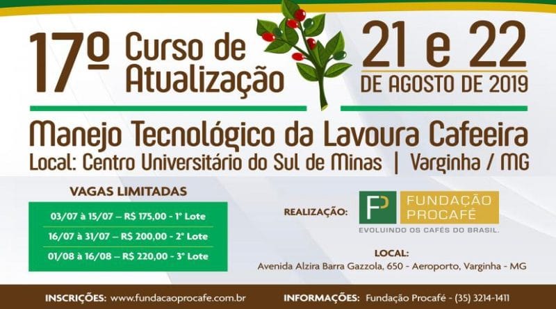 Entre os dias 21 e 22 de agosto, a Fundação Procafé realiza o 17º Curso de Atualização Manejo Tecnológico da Lavoura Cafeeira, no Centro Universitário Sul de Minas, em Varginha (MG).