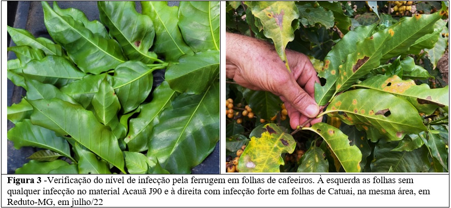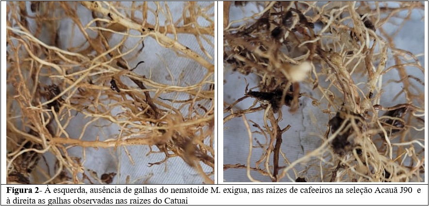 Uma nova geração, seminal, foi derivada da J90, agora plantada em um lote de cerca de 100 plantas, no município de Reduto, também na Zona da Mata de MG. O plantio foi efetuado, em 2019, sobre uma área em substituição parcial de uma lavoura de Catuai/44, permitindo que fosse possível, através do exame das raízes, observar nas duas áreas próximas, as raízes dos dois materiais. Verificou-se que não havia qualquer presença de galhas nas raízes das plantas do J90, enquanto as remanescentes de Catuai apresentavam muitas galhas, típicas do nematoide M. exígua, indicando que a J90 se mostrava resistente à infestação por esse nematoide (figura 2). Da mesma forma, as observações sobre infecções pela ferrugem resultaram negativas nas folhas dos cafeeiros da seleção J90, mostrando uma condição de imunidade, diferentemente do que aconteceu nas do Catuai, onde a infecção evoluiu muito (figura 3). Quanto à verificação do tamanho dos grãos, os resultados mostraram, no café colhido das plantas em Reduto, que o Acauã J90 tinha 77% de peneira 17 acima e os frutos do Catuai apresentaram 40% desse tipo de grãos (figura 4).