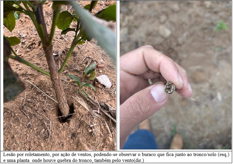 As condições para diferenciar as lesões por vento, também chamadas de canela de vento, são as seguintes – Elas podem ser observadas principalmente nas partes mais altas do terreno, onde venta mais. As lesões aparecem bem junto ao solo e até logo abaixo da sua superfície, pois são o resultado do atrito do tronco da planta com o solo. Aparecem fissuras no tecido, muitas vezes engrossando a casca e as plantas, em muitos casos, acabam quebrando o tronco ou tombam. As plantas afetadas amarelam lentamente e chegam a morrer, podendo aparecer brotações abaixo do tronco rompido. É importante, na identificação, também observar um buraco oco, junto ao solo, formado pela movimentação do tronco pelo vento.