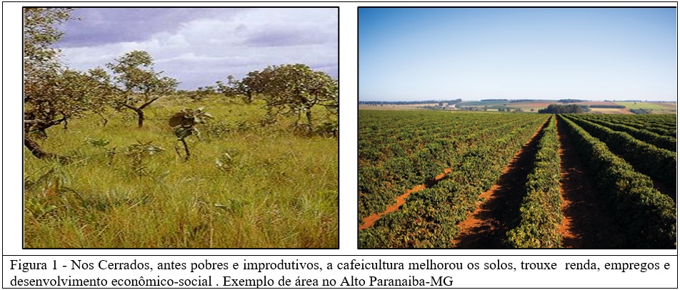 1-Abertura de novas áreas cafeeiras – os novos cafezais foram implantados em zonas climaticamente adequadas, para as espécies arabica ou canephora. Pode-se destacar o aproveitamento dos cerrados -cerca de 700 mil ha e safras anuais de 20-25 milhões de sacas/ano e outras novas áreas – no Planalto e Chapada Diamantina na Bahia, micro-climas no Ceará e Pernambuco, o Jequitinhonha e o Norte de Minas, e as áreas altas do Espirito Santo, da Zona da Mata de Minas e do estado do Rio de Janeiro.(fig 1)