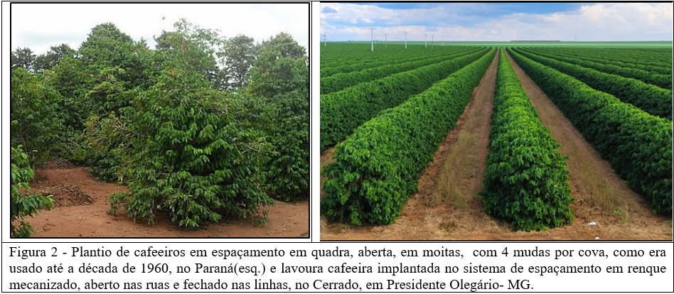 2-Novos espaçamentos e sistemas de plantio – o espaçamento tradicional – da época, de 3-4 x 3-4 m, com 4 mudas por cova, com apenas 650- 800 cvs por hectare evoluiu para o plantio em renque, aberto ou adensado, com mais de 5000 pl/ha.(fig 2).