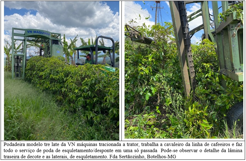 As podadeiras mais modernas já evoluíram para o trabalho a cavaleiro da linha de cafeeiros, assim podendo fazer o serviço em uma só passada, esqueletando os dois lados e decotando. Esse maquinário, tomando como exemplo a máquina da VN TRE LATI, pode fazer a poda completa de cerca de 4-5 hectares por dia, dependendo da velocidade usada, que pode variar de 1,5 a 3 km por hora, dependendo do volume e dureza da ramagem a ser cortada, devendo ser mais lenta em lavouras mais lenhosas. A máquina da VN possui um sistema de barra atrás, para o decote e 2 barras laterais, munidas, cada uma, de 8 facas, de tipo semelhante daquelas usadas para desengrosso de madeira. Em caso de necessidade de decote de hastes mais grossas pode-se usar discos no lugar da barra, em cima. Essas barras, tanto a de decote como as de esqueletamento, podem ser reguladas em altura e em abertura lateral.