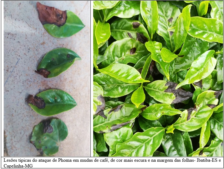 O ataque de Phoma/Ascochyta em mudas foi muito forte, este ano, em regiões do Espirito Santo, das Matas e do Jequitinhonha, em Minas Gerais. Foram verificados os sintomas típicos das doenças, sendo manchas circulares e mais claras, que caracterizam Ascochyta e negras, mais nas margens das folhas, indicando a ocorrência de Phoma. Alguns poderiam suspeitar do ataque de Pseudomonas, porém, por se tratar de regiões mais quentes e mais ao norte, essa doença só foi relatada uma vez, assim mesmo em lavoura a cerca de 1500 m de altitude, no Caparaó-MG, mas, depois, desapareceu. Além disso, os sintomas se distinguem pois, além as lesões são diferenciadas no ataque de Pseudomonas, e, ainda, ocorrem ataques e morte também no caule, no ponteiro das mudas. Nas lesões primárias dessas doenças, eventualmente, podem entrar fungos oportunistas, como o Colletotrichum, que ajudam a ampliar a área lesionada nas folhas.