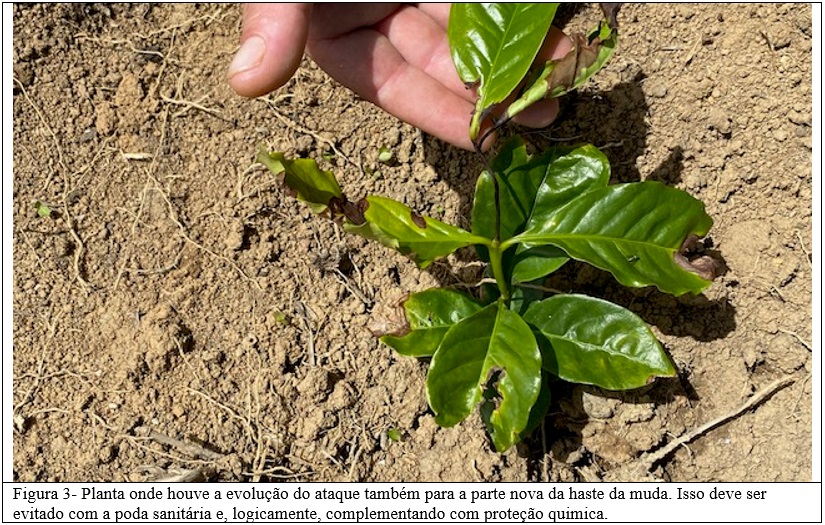 Verificou-se, em campo, que a redução do inóculo é relativamente fácil em plantios novos e em cafeeiros em formação, justamente as condições onde ocorrem maiores problemas da bacteriose. Basta cortar e coletar em saco (depois eliminar) as partes doentes, folhas ou ramos. Uma experiência nesse sentido foi feita recentemente, visando levar a campo apenas mudas sem inóculo e, também, eliminando o inóculo, através do corte das partes lesionadas das plantas, em área de plantio recente. Verificou-se que o serviço pode ser feito rapidamente.(figuras 1 e 2). Com isso vai ser possível reduzir o ataque, diminuindo sua evolução para o caule novo da planta e evitando o risco de provocar sua morte (figura 3). Como já mencionado, a poda sanitária pode ser acoplada a uma proteção química.