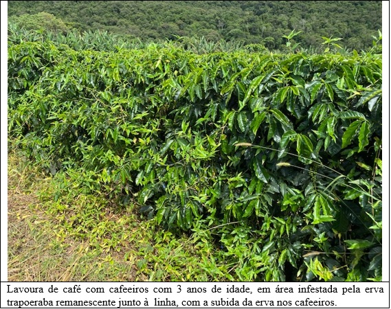 As ervas que crescem dentro das lavouras de café podem concorrer com os cafeeiros, em água, nutrientes e luz e, sem controle, causam perdas de produtividade na faixa de 30-40%. Essas ervas, comumente chamadas de plantas ou ervas daninhas, podem ser de vários tipos, conforme sua característica vegetativa, podendo ser de folhas largas ou estreitas, de hábito perene ou temporário, de crescimento rasteiro, erecto ou trepador.