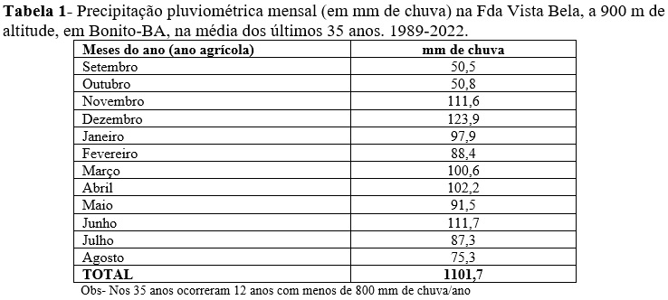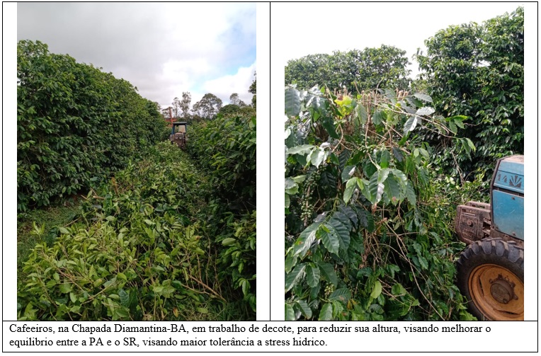 Na região cafeeira da Chapada Diamantina, na Bahia, o regime de chuvas tem sido deficiente na maior parte do ano, especialmente no período outubro a fevereiro, época crítica para o cafeeiro, onde ocorre o crescimento e a frutificação das plantas.(ver tabela 1). Nessa região tem sido verificados bons resultados no uso de poda, tipo decote baixo, para melhorar a condição dos cafeeiros, isto porque as plantas podadas passam a apresentar um melhor equilíbrio entre a sua parte aérea e o sistema radicular. Assim, o sistema radicular consegue abastecer melhor, de água, a copa da planta, agora reduzida e com menor consumo.