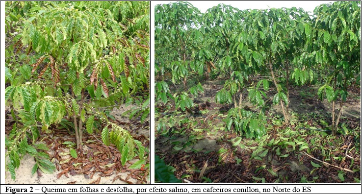 A aplicação de fertilizantes sólidos em superfície, de forma concentrada em área muito pequena (muito típico em aplicações manuais) provoca altas concentrações de sais no sistema radicular, com danos visíveis na parte aérea (figuras 1 e 2). Esses danos foram observados em cafeeiros conillon, na região Norte do Espirito Santo. O efeito salino pode provocar queima e desfolha nos cafeeiros e, em casos graves, e em plantas mais jovens pode até matar as plantas. Os danos pelo efeito salino podem ser observados em grandes extensões ou de forma aleatória, ou seja, em poucas plantas. Muitas vezes os técnicos e produtores desavisados podem confundir ou atribuir os sintomas de efeito salino a eventual ataque de patógenos, estresse hídrico, escaldaduras, deficiências minerais, senescência etc.