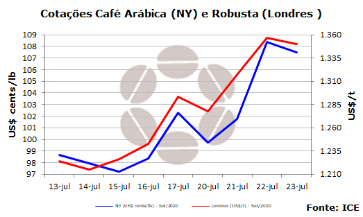 Os contratos futuros do café passaram por um movimento de correção nos mercados internacionais e fecharam a semana em declínio. Na Bolsa de Nova York, o vencimento dez/2020, o mais negociado, encerrou a sessão de ontem a US$ 1,1895 por libra-peso, com perdas de 265 pontos. Na ICE Europe, o vencimento nov/2020 recuou US$ 8, negociado a US$ 1.353 por tonelada.