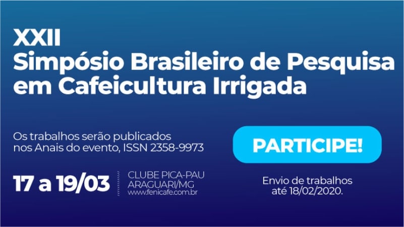 Fique atento! As inscrições para participação do 22º Simpósio de Cafeicultura Irrigada estão abertas e podem ser realizadas no site www.fenicafe.com.br até o dia 18 de fevereiro. O Simpósio faz parte da programação da Fenicafé, que acontece de 17 a 19 de março de 2020 em Araguari, no Triangulo Mineiro. As normas para envio dos trabalhos também estão disponíveis no site da Fenicafé; além do envio via correio eletrônico para todos os pesquisadores. O Comitê Científico do Simpósio emitirá o primeiro parecer a respeito dos trabalhos até o dia 27/02/2020, devendo as correções finais serem feitas no site até o dia 10 de março.