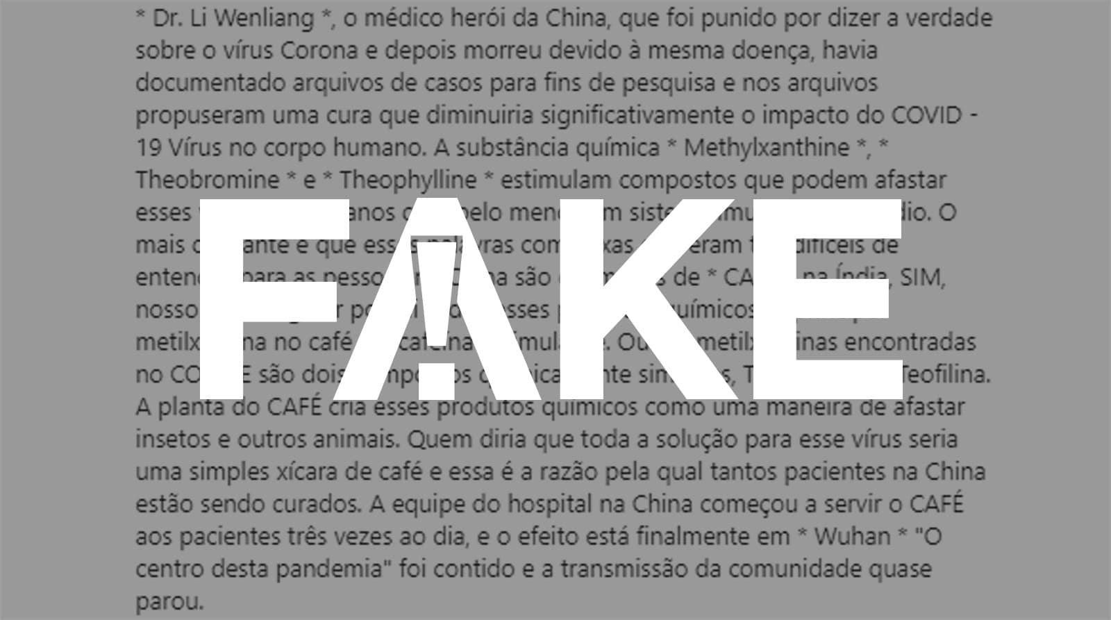 Segundo a mensagem falsa, o médico chinês – que tinha 34 anos e chegou a ser investigado pela polícia chinesa, sob acusação de espalhar boatos relacionados ao novo vírus – tinha documentos que comprovam que a metilxantina, a teobromina e a teofilina, encontradas no café, em chás e no chocolate, “diminuem significativamente o impacto da Covid-19”.