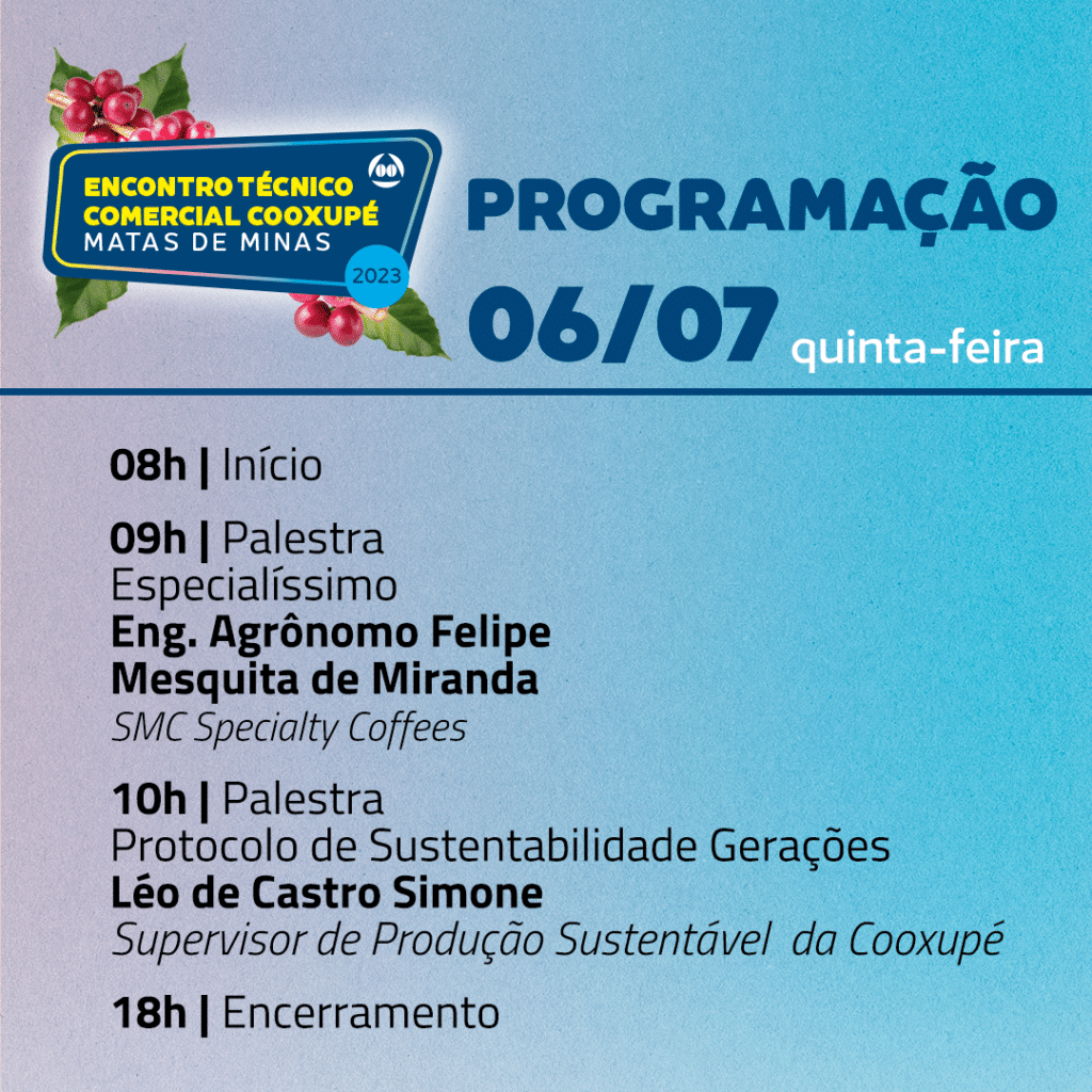 Antes de mais nada, a programação do encontro técnico começa às 8h do dia 5 de julho, quarta-feira. Às 8h30, a abertura do evento contará com o gerente do Núcleo Manhuaçu da Cooxupé, José Vitor, e diretores da cooperativa.