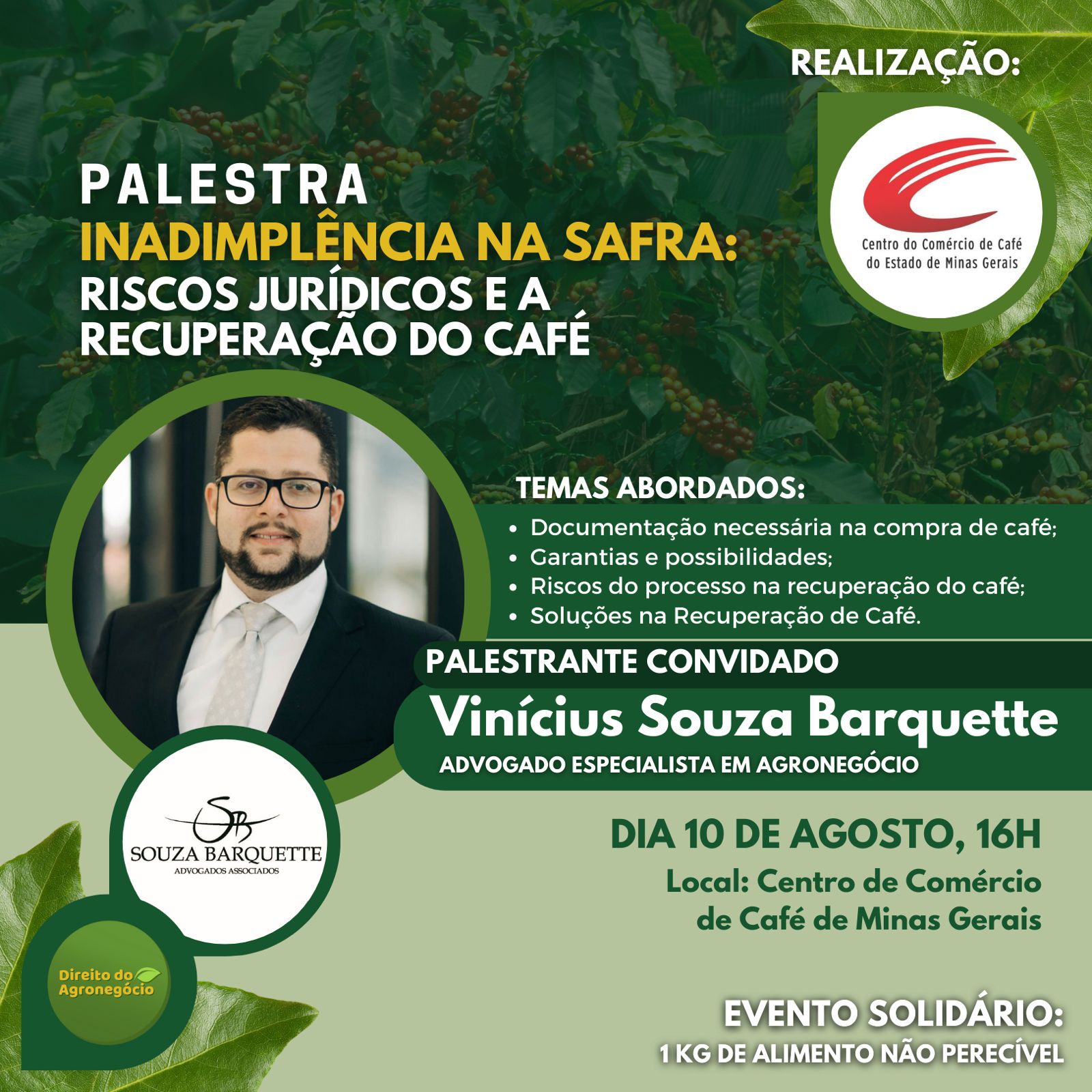No dia 10 de agosto, às 16 horas, será realizada no auditório do CCCMG a Palestra Inadimplência na Safra: Riscos Jurídicos e Recuperação do Café.