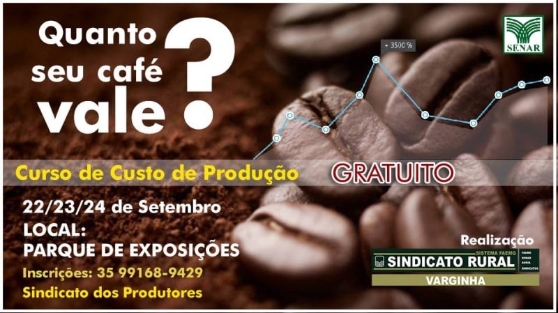 O Sindicato dos Produtores Rurais de Varginha realiza, nos dias 22, 23 e 24 de setembro, a partir das 17h, o Curso de Custo de Produção no Café. A iniciativa é totalmente gratuita e realizada no Parque de Exposições em Varginha.